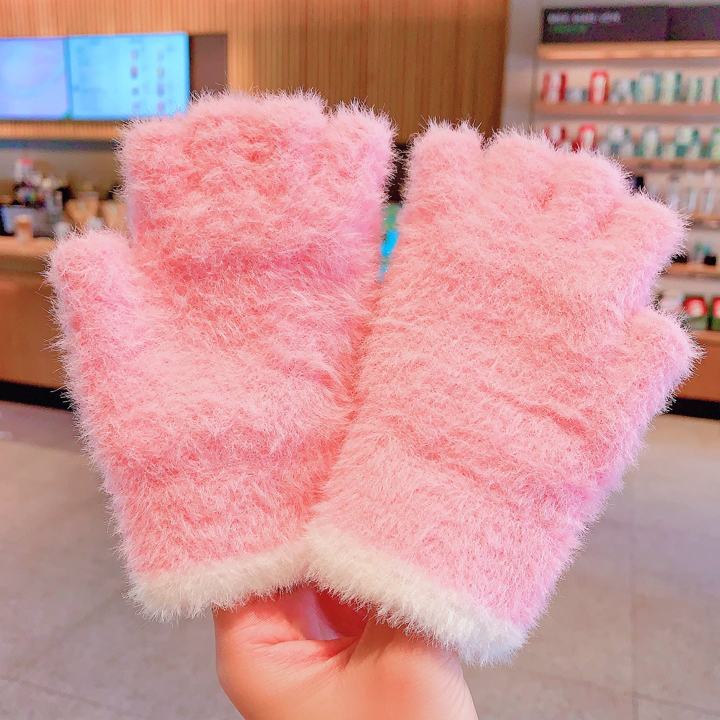 Fingerless Flap Cover Gloves Winter Knit Warm Mittens Soft Lined Fleece Thermal Outdoor Half Finger with Cover Convertible Flip Top for Kids boys girls (Pink Cat))
