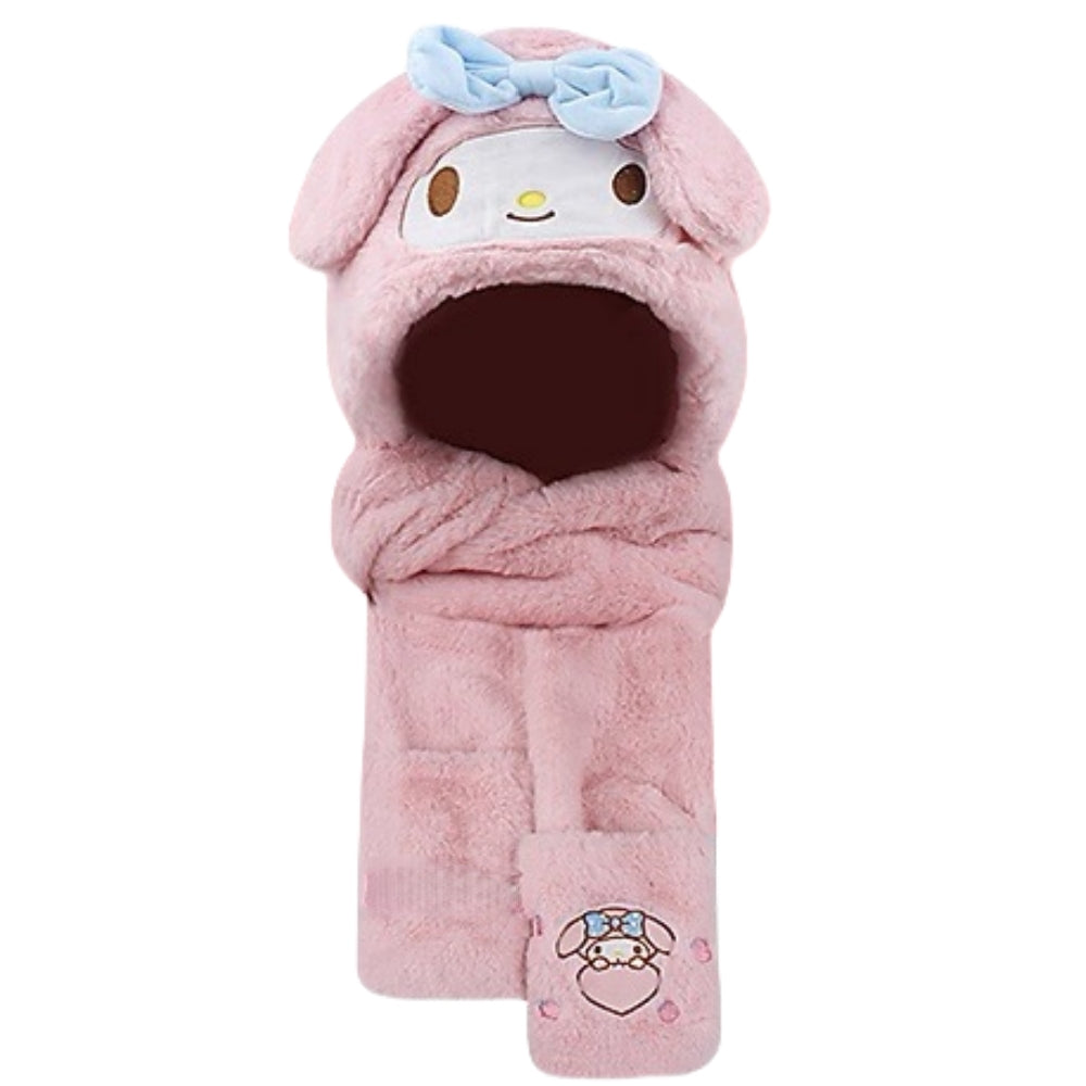 Kids Cartoon 3 in 1 Hat Scarf Gloves Set Winter Warm Fleece Stch Faux Fur Hoodie Full Hood Thick Thermal Scarves Gifts for Boys and Girls Kids( Kuromi)